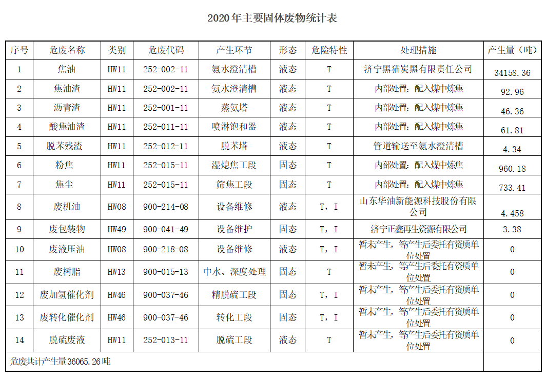 2020年,全公司工业固体废物产生量36065.26吨,自行利用量279.07吨,委托有资质单位处置量35786.19吨。