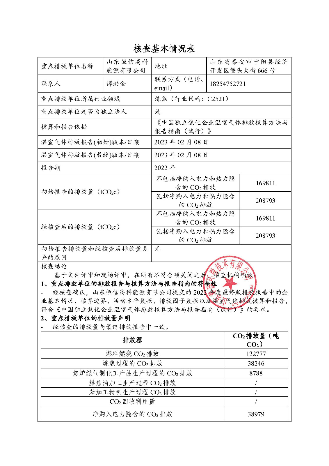 山东恒信高科能源有限公司2022年度温室气体排放核查报告